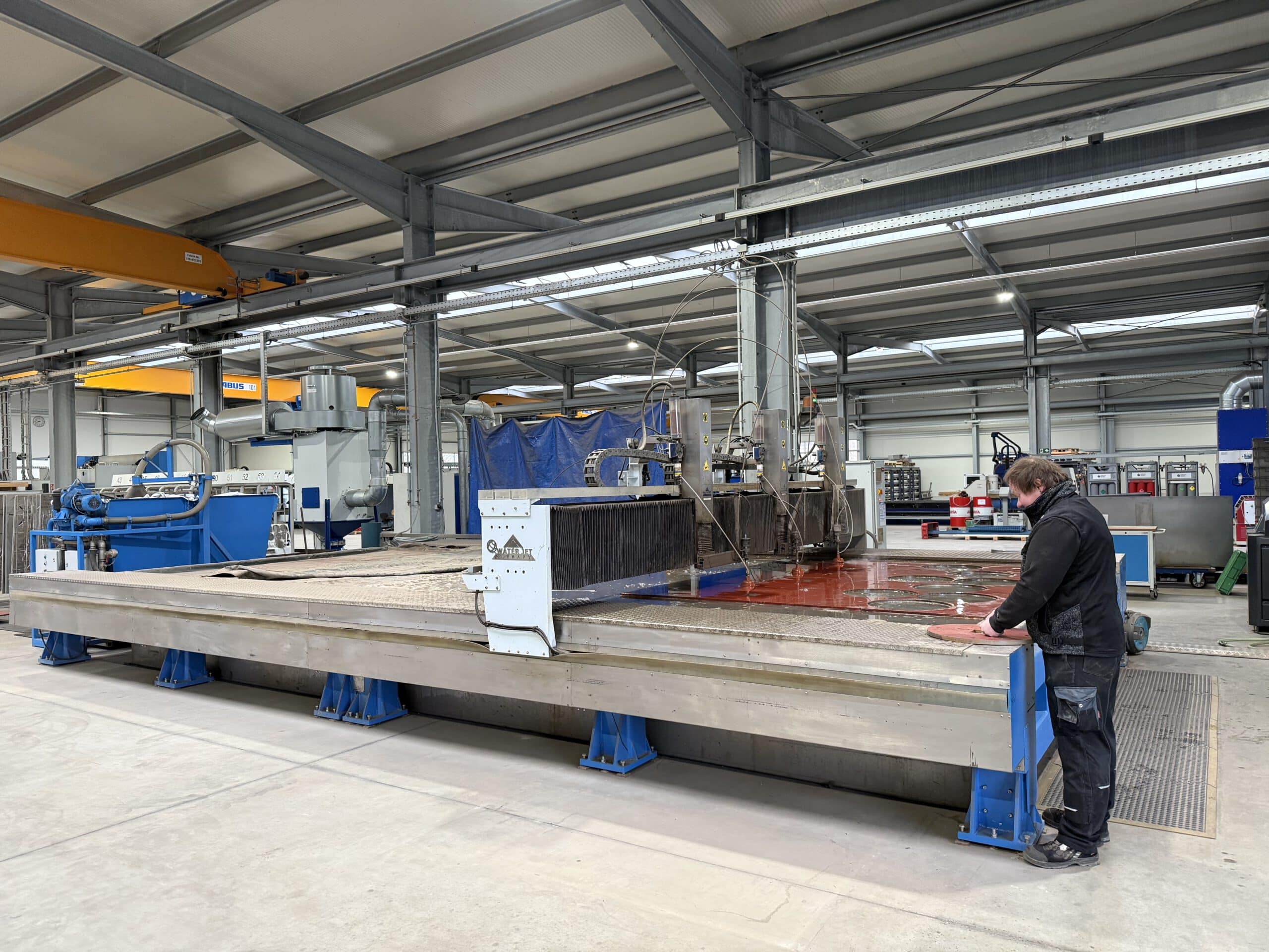 Das abrasive Wasserstrahlschneiden wird auf großen Arbeitstischen mit 6150 x 3150 mm effektivem Arbeitsbereich mit höchster Genauigkeit durchgeführt.